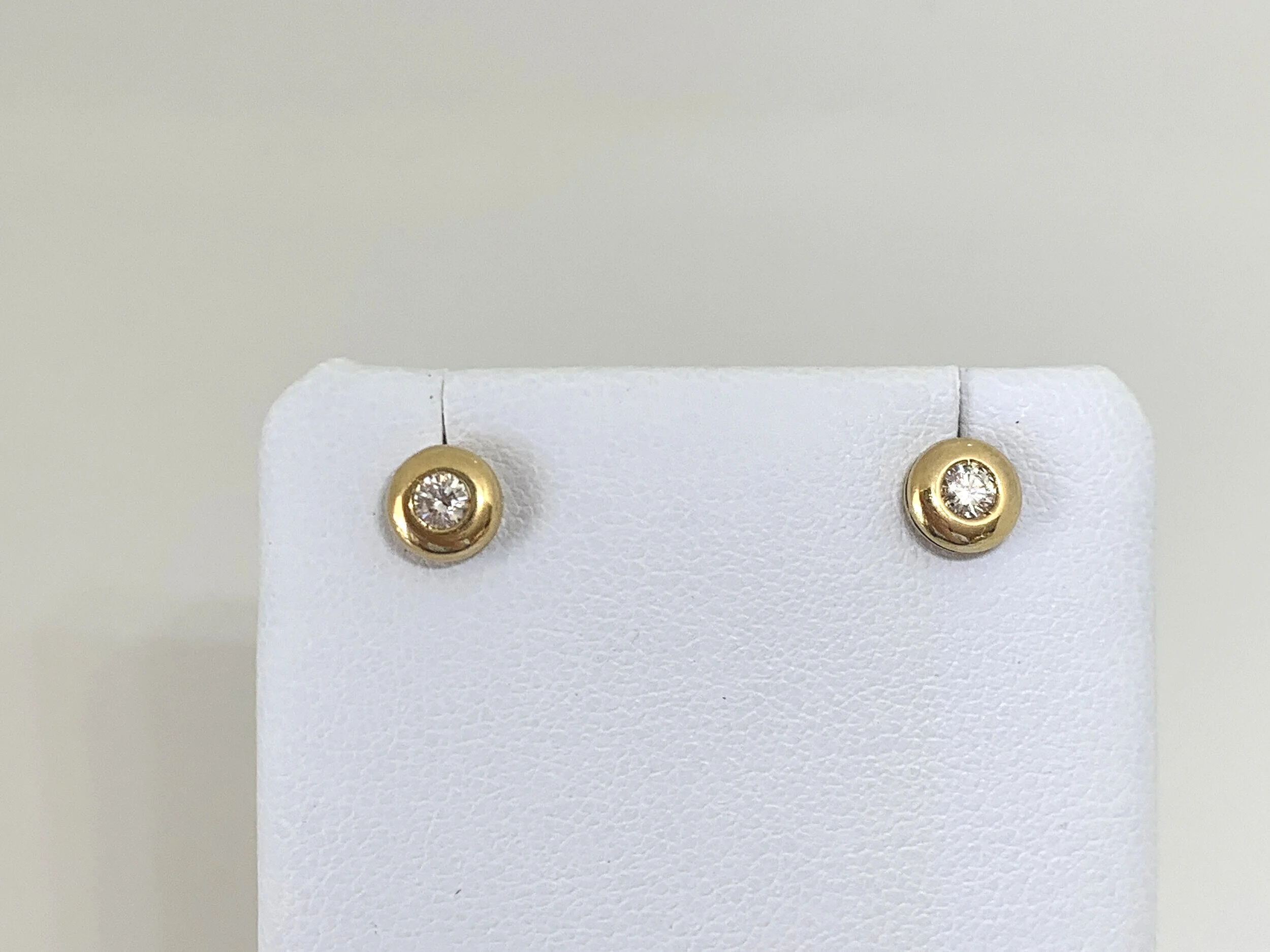 Are bezel set with 2 x Diamonds in 18ct yellow gold that weigh at total of .19ct. The Diamonds are graded SI clarity and colour H-I by the valuer, so they are nice quality. The earrings have strong posts and are secured with butterfly clips.
